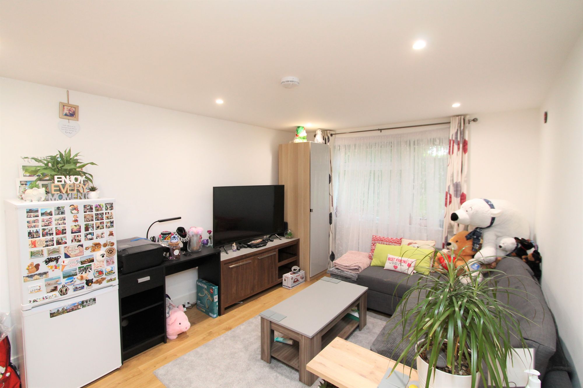 About this property Ideally positioned with convenient access to local amenities and set in a location that offers both tranquillity and charm, this stylish ground floor flat presents an exceptional opportunity for modern living. The property is beautifully maintained throughout and is perfectly suited to professionals or couples seeking a contemporary and comfortable home. Upon entering through a private entrance, you are greeted by a welcoming hallway that leads directly into a spacious open plan living area. The living space is bathed in natural light thanks to large windows, and features elegant wooden flooring, creating a warm and inviting atmosphere. The seamless flow between the lounge and kitchen makes it ideal for both every-day living and entertaining guests. The kitchen is a true highlight, fitted with high-gloss modern units and integrated appliances that include a built-in oven, hob, and extractor fan. A central kitchen island provides additional workspace and casual dining options, while integrated lighting adds a touch of sophistication. The abundance of natural light ensures a bright and airy feel throughout this sociable space. The generously sized bedroom features a built-in mirrored wardrobe that maximises storage and enhances the sense of space. Neutral decor and recessed lighting create a serene environment, offering a restful retreat at the end of the day. The bathroom is finished to a high contemporary standard, boasting a sleek walk-in shower with a luxurious rainfall showerhead. Elegant tilework, a well-lit vanity area, and modern fixtures combine to deliver a hotel-quality experience in the comfort of your own home. Externally, the property benefits from a charming garden area, ideal for outdoor relaxation or entertaining during the warmer months. The traditional brick facade adds character and kerb appeal. Additional features include ample built-in storage, modern recessed lighting throughout, and a private entrance that ensures both security and exclusivity. This ground floor flat is offered with a leasehold tenure, presenting an excellent opportunity for discerning buyers to secure a move-in ready home in a sought-after setting. EPC Rating: C