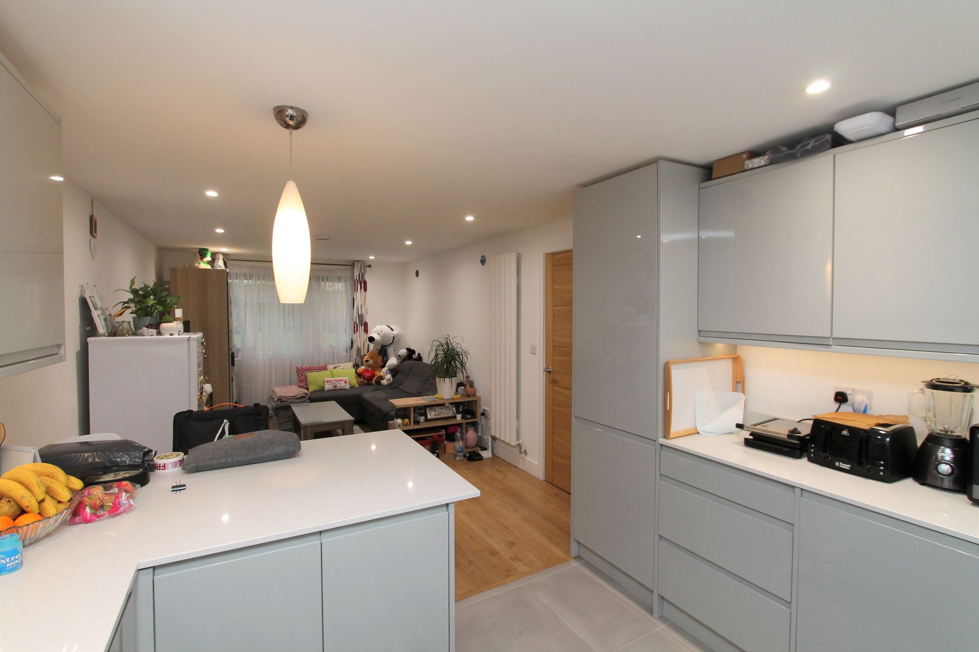 The kitchen is a true highlight, fitted with high-gloss modern units and integrated appliances that include a built-in oven, hob, and extractor fan. A central kitchen island provides additional workspace and casual dining options, while integrated lighting adds a touch of sophistication. The abundance of natural light ensures a bright and airy feel throughout this sociable space.
